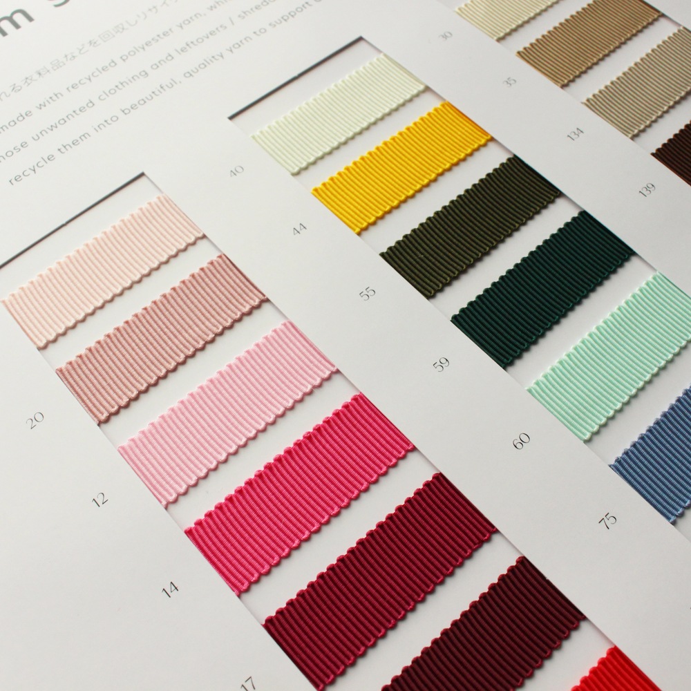 SDGsの意識が高まる昨今、廃棄される衣料品などを回収しリサイクルした再生ポリエステルの糸RENUⓇ100%で作られたサステナブルなグログランリボンです。