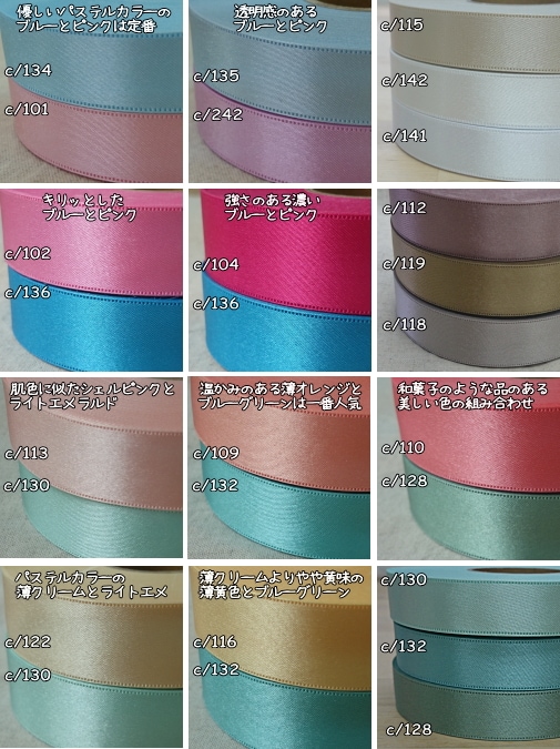 美しい光沢と適度なハリがあるリボンなのでウエディングのブーケプルズやリングリレー、ロゼット、ラッピングに最適です。