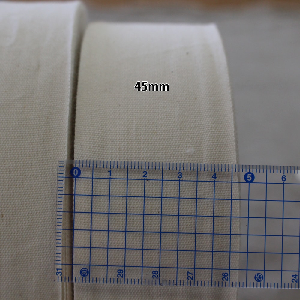 【4m巻き】 数量1=4m 数量3=12m(4m×3) 【1反単位】 数量1=1反(50m) 数量3=3反(50m×3) ●未ソーピング商品のため、縮みを考慮し規格サイズの約2-3mmプラスになっています。 例)20mm規格→23mm程度、 40mm規格→43mm程度、 45mm規格→48mm程度 お洗濯するものに付ける場合は水通し後アイロン整形してからお使いください。 お洗濯せずこのままお使いになる場合は幅にご注意ください。(返品交換対象になりません) ●綿100%の平織りテープです。