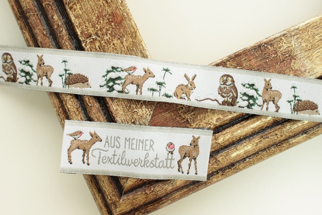 acufactumアクファクトゥム【50cm単位】約幅16mm-ブルードットと動物たち(キツネ・リス・鹿・イノシシ・ウサギ)柄ジャガードリボン