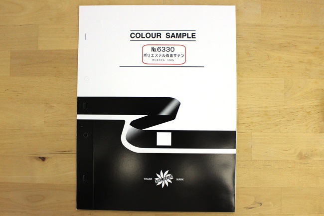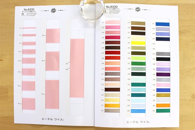 No,6330 54色 両面サテンリボン サンプル帳2つ折りの現物が貼ってあるサンプル帳です。サイズやお色の確認にお使いください。
