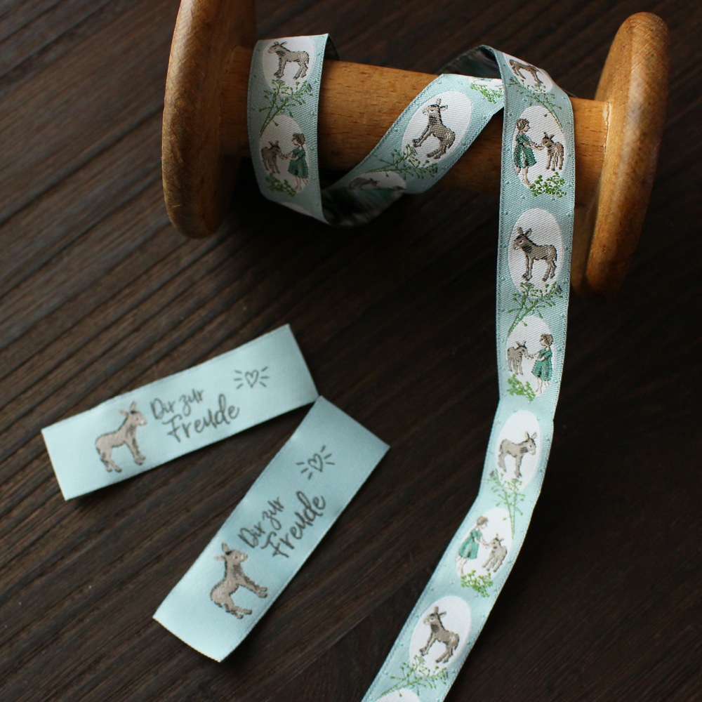 acufactumアクファクトゥム【50cm単位】約幅16mm-縦柄/ロバと少女柄ジャガードリボン