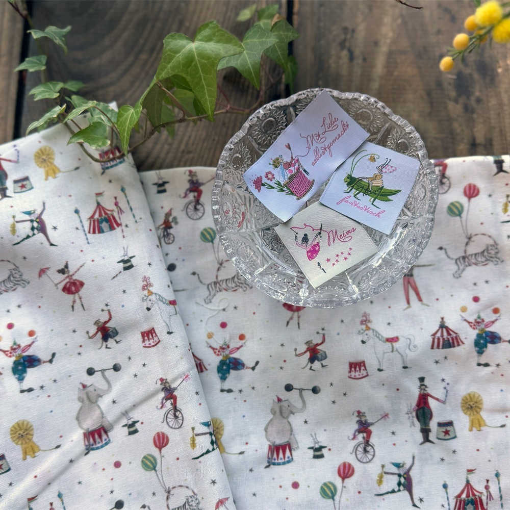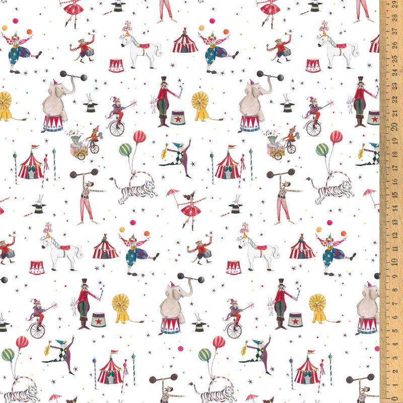 このコットン生地には、エキサイティングなサーカスの動物たちと魅力的なアーティストたちで彩られた、生き生きとした情景が描かれています。